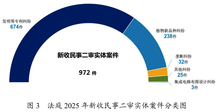 法庭新收民事二审实体案件972件。其中,发明等专利纠纷674件,植物新品种纠纷238件,垄断纠纷32件,集成电路布图设计纠纷3件,其他纠纷25件。