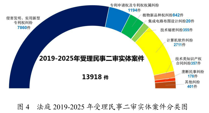 法庭共受理民事二审实体案件13918件。其中,侵害发明、实用新型专利权纠纷7860件,专利申请权及专利权权属纠纷1194件,植物新品种权纠纷842件,集成电路布图设计纠纷20件,技术秘密纠纷355件,计算机软件纠纷2711件,技术类知识产权合同纠纷357件,垄断民事纠纷178件,其他纠纷401件。