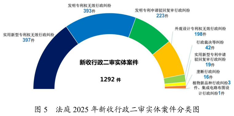 法庭新收行政二审实体案件1292件。其中,发明专利申请驳回复审行政纠纷223件,发明专利权无效行政纠纷393件,实用新型专利申请驳回复审行政纠纷19件,实用新型专利权无效行政纠纷397件,外观设计专利权无效行政纠纷198件,植物新品种行政纠纷3件,集成电路布图设计行政纠纷1件,垄断行政纠纷16件,行政裁决等纠纷42件。