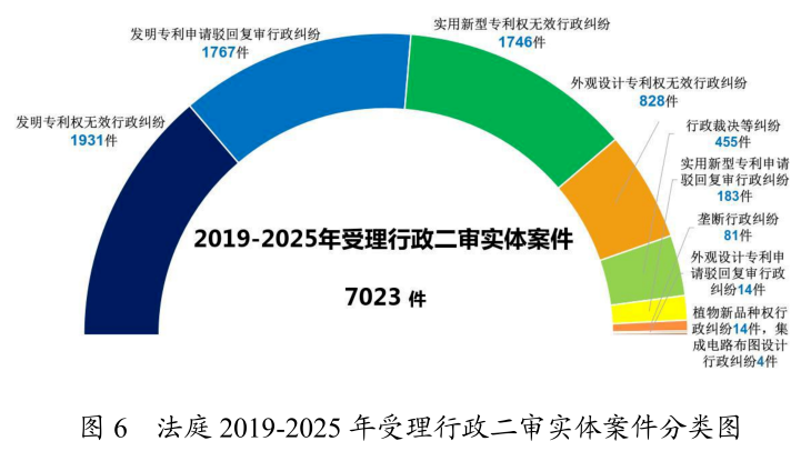 法庭共受理行政二审实体案件7023件。其中,发明专利申请驳回复审行政纠纷1767件,发明专利权无效行政纠纷1931件,实用新型专利申请驳回复审行政纠纷183件,实用新型专利权无效行政纠纷1746件,外观设计专利申请驳回复审行政纠纷14件,外观设计专利权无效行政纠纷828件,植物新品种权行政纠纷14件,集成电路布图设计行政纠纷4件,垄断行政纠纷81件,行政裁决等纠纷455件。