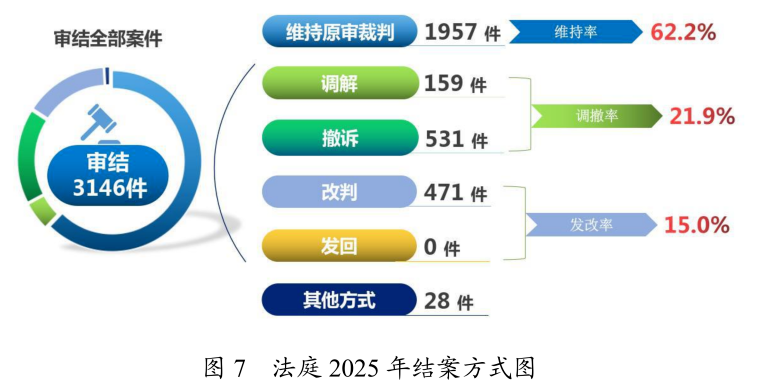 法庭共结案3146件,以维持原审裁判方式结案1957件,占62.2%;以撤诉方式(含撤回上诉和撤回起诉,下同)结案531件,占16.9%;以调解方式(出具民事调解书,下同)结案159件,占5.1%;以改判方式结案471件,占15.0%;以其他方式结案28件,占0.9%;无发回重审案件。