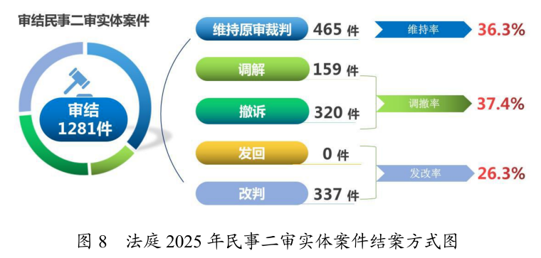 法庭审结的1281件民事二审实体案件中,以维持原审裁判方式结案465件,占36.3%;以撤诉方式结案320件,占25.0%;以调解方式结案159件,占12.4%;以改判方式结案337件,占26.3%;无发回重审案件。