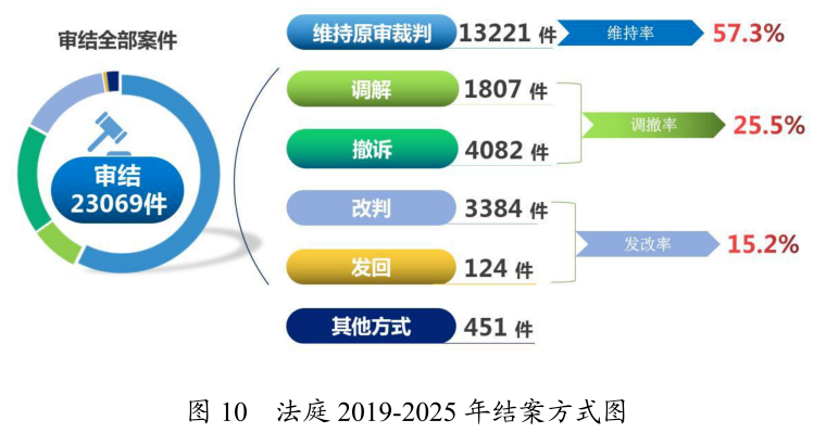 法庭共结案23069件,以维持原审裁判方式结案13221件,占57.3%;以撤诉方式结案4082件,占17.7%;以调解方式结案1807件,占7.8%;以发回重审方式结案124件,占0.5%;以改判方式结案3384件,占14.7%;以其他方式结案451件,占2.0%。