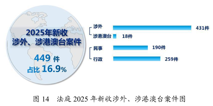 法庭新收涉外、涉港澳台案件449件,占全部新收案件的16.9%。其中,新收涉外案件431件,占全部新收案件的16.2%;新收涉港澳台案件18件,占全部新收案件的0.7%;新收民事案件190件、行政案件259件。共审结涉外、涉港澳台案件492件,同比增长15.8%,占结案总数的15.6%。