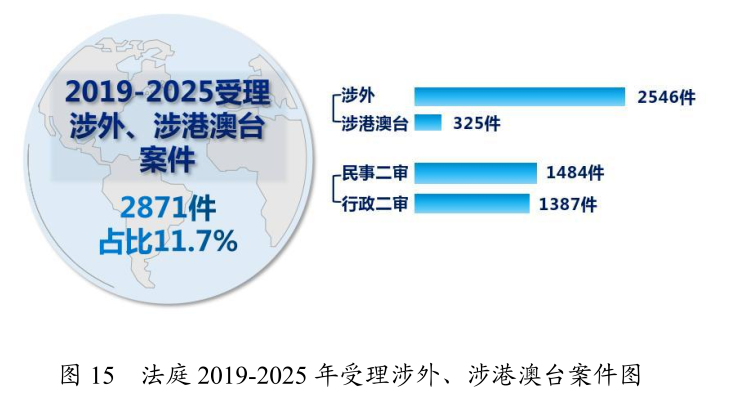 法庭共受理涉外、涉港澳台案件2871件,占全部案件的11.7%。其中,涉外案件2546件,占全部案件的10.3%;涉港澳台案件325件,占全部案件的1.3%;共受理民事案件1484件、行政案件1387件。共审结涉外、涉港澳台案件2339件(其中涉外案件2046件),占全部审结案件的10.1%。