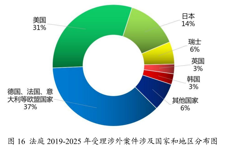 法庭受理的涉外案件主要来自德国、法国、意大利等欧盟国家和美国,分别占比37%和31%;涉及亚洲地区的案件主要来自日本和韩国,分别占比14%和3%。